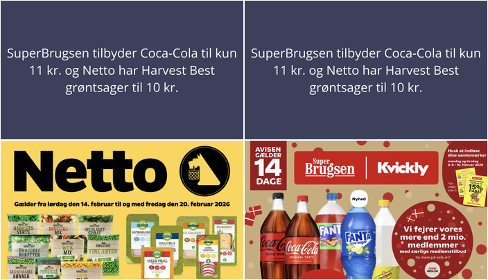 SuperBrugsen har et godt tilbud på Coca-Cola, Fanta eller Schweppes i 125-150 cl flasker til kun 11 kr. pr. stk. Tilbuddet gælder fra fredag d. 6. februar til og med torsdag d. 19. februar 2026.